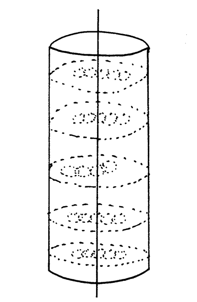 This cylinder represents the "American human situation." It is composed of five basic dimensions: (a) political; (b) economic; (e) social; (d) educational; and (e) technological. The large circles within the cylinder represent these dimensions. Further more, within these dimensions are others dimensions. These are individuals that interact. These individuals are represented by the smaller overlapping dotted circles. The line that runs vertically through all five dimensions indicates that they are related in an ecological ecosystem sense. That is, any change in one of the dimensions stimulates a change or reaction in all of the other dimensions. For example, the creation of the airplane (technological) stimulated a corresponding change in all four of the other dimensions: educational programs were developed to train people to maintain the equipment; people throughout the country became closer together (social); and new policies (political) were created to finance (economic) the development of air technology. The human situation or the facts of the American society are that these dimensions are never isolated from each other.